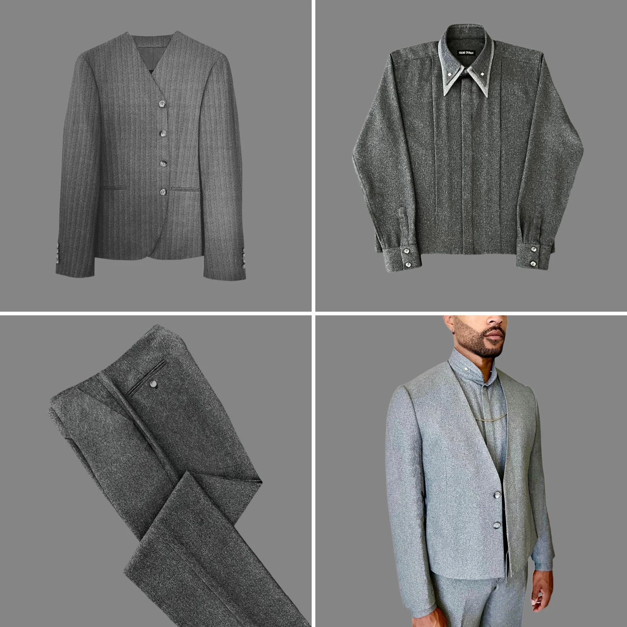A hip luxury tailoring experience, starting with a virtual 1:1 line preview, then a concierge fitting with selected samples to be made to your measurements and choice of color in six to eight weeks with a quality and fit guarantee.